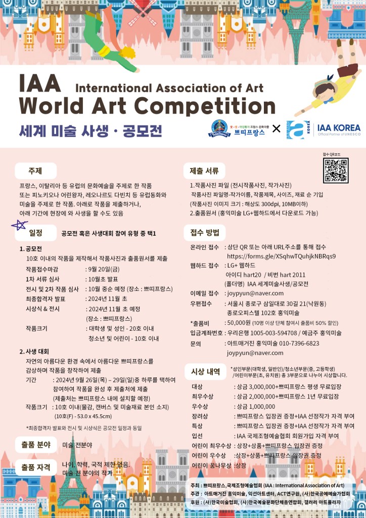 IAA 국제조형미술협회와 쁘띠프랑스가 IAA 세계미술 사생ᆞ공모전을 공동 주최합니다. 전 세계의 우수한 미술작가를 선발하기 위한 사생ᆞ공모전에 많은 참여바랍니다.