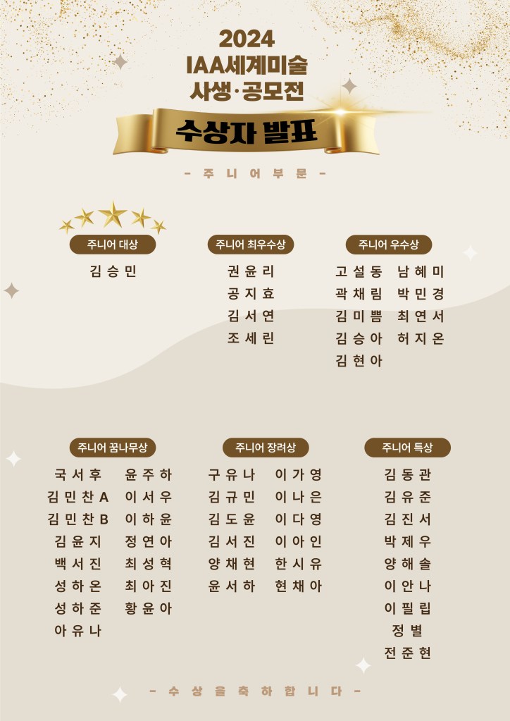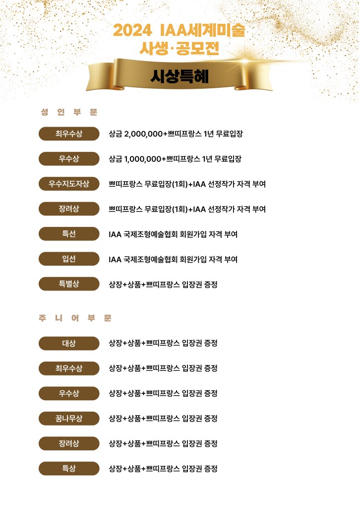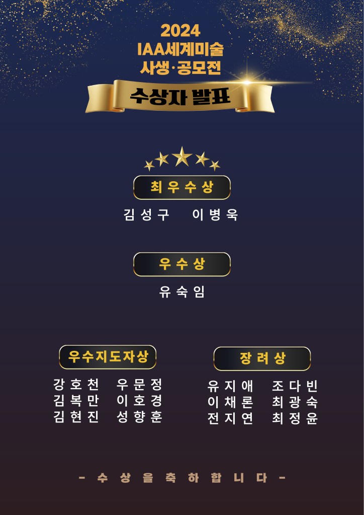 * 시상식 일정: 2024년 11월 11일 (월) 오후 3시, 다빈치 전시관 지하 1층 IAA 세계미술 사생공모전 전시장